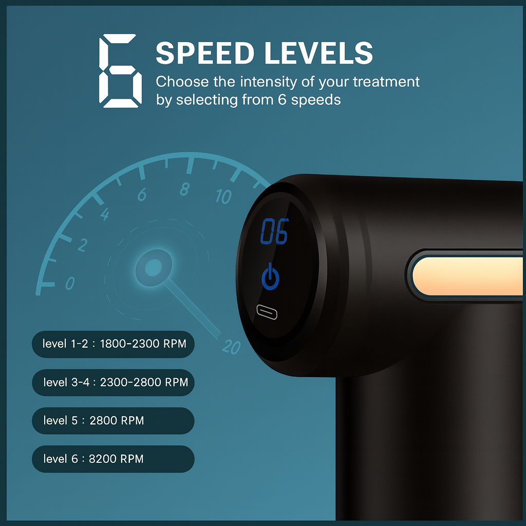 Select your preferred massage head and power on the device. Choose from 6 adjustable speed levels to match your comfort. For best results, apply to sore or tight muscles for 5–10 minutes daily. The ergonomic design makes it easy to use on legs, back, shoulders, and more.